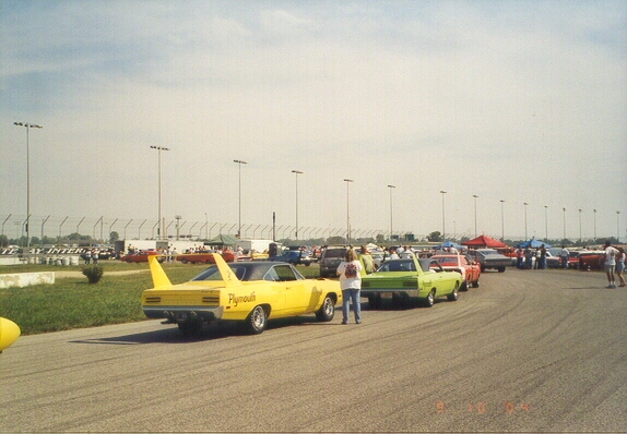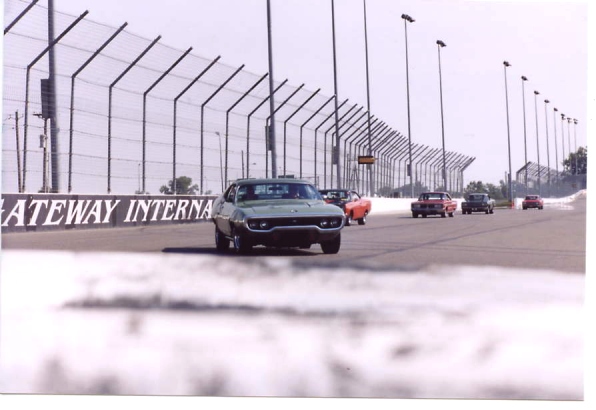 About 3 o'clock in the afternoon, our members lined their cars up on pit road and prepared to go out on the racetrack. The pace car took us out in groups of 20 and we did several fast laps around the circle track. Cotton road around the track with Rich Bolzenius in his Lemontwist yellow 440+6 Superbird. This is always a highlight for the members, and ONLY WW/NBOA members get to go out on the track and do the laps. After the laps, most of the members left Gateway and headed back to the hotel to get cleaned up before supper--it had been a very hot and humid day at the track.