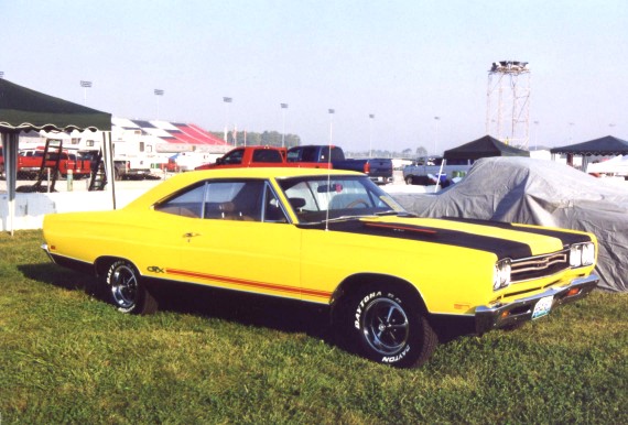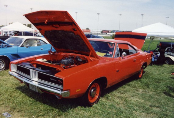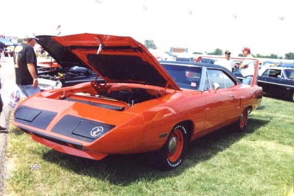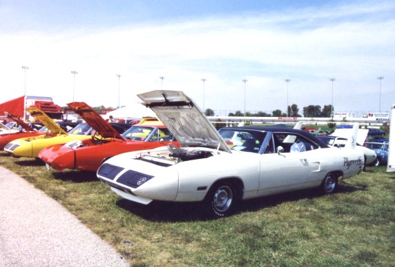 Saturday morning, everyone headed out to Gateway International where we had to wait in a long, hot line before we were able to make our way to the special Winged Warriors/NBOA parking area reserved for the members. Some members set up their tents and chairs, anticipating the need for a shady spot later in the day, while others immediately took off for the huge all-Mopar swap meet. Still others went over to watch the drag racing action. Dot and Cotton Owens were situated under a tent with their Dodge racecar right in the middle of the Winged Warriors/NBOA members. Dot sat at a long table and sold T-shirts from "Cotton Owens Garage" and postcards, while Cotton posed for pictures and signed autographs all day. At the end of the WW/NBOA, Mike Eberhardt had the Turbine car on display, occasionally starting it up to give people rides.