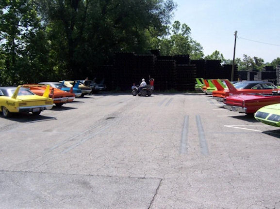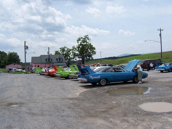 The remaining cars then cruised to Rita and Barry's for a farewell cookout, during which Rick Edwards and Stan McGuire did minor repairs to their cars. Stan--"It ain't a road trip if you don't have to fix one". There was nearly a constant train of cars pulling up to look at the cars and take pictures. the group then cruised to a local cruise-in at Liberty University, which takes place every third Saturday, April through October. Having seven wing cars, a '74 Charger Rallye and Stan's Runner convertible created quite a stir, as we had our own area roped off. We inadvertently hurt the feelings of the local Thunderbird club, as they were three rows down from us. Nearly every time you looked at the late '50s T-birds, the owners were all standing at the back of their cars looking like a bunch of Maytag repairmen as they watched everyone coming up to look at the wing cars. Thus ended this year's meet.