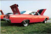I had a lot better feeling on this trip. Felt better about the fact I had more documentation and good quality pictures and the movie. We drove down and when we got there, we called him and went straight to his house. He opened his doors and arms like he had known us all of his life. That's the way Mopar people are. After the tour of the house and the RoadRunner room, with all of his RoadRunner toys, his wife said, "Dear, I think they want to see the car!" "Oh yeah," he said and took us out to the garage. There it was. Just as promised. Getting a little crowded around the car. You could tell he had not used it much lately. He started it up and we took it for a cruise. It was a done deal. We loaded it up and said our goodbyes and thanks and we were on our way home. We had no problems on the ride home. Stopped to sleep...yeah, right. The car of my dreams on a trailer in a town I knew nothing about. I slept with one eye open for about six hours and we were on our way home. And yes, I did all of the driving. We have been showing the car for four years now. We have made some changes to the car: 15" Rallyes, new door panels, headliner, vinyl top, reproduction battery, correct wing, new exhaust, re-chromed front bumper, electronic ignition and lots of TLC under the hood. But the car was done correct to begin with. I was able to get the name of the person who restored the car and it was the gentleman's first full restoration. I talk to him about once a year. As you can see, the car is holding up well. It's been done about 12 years now and shows some signs of wear, but overall shows well.