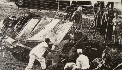 I guess the worst one, I was probably sixteen or seventeen years old, driving midgets in Norfolk, Virginia on a quarter-mile dirt track, and a radius rod broke on the right side and dug in, car jumped up on the fence The fence was made out of cross ties and poles. The car got up on one of those cross ties and flipped over. I knew that I was lying under the car but I didn't know where. I could hear the other cars coming down the back stretch and I was waiting to get run over. I couldn't focus. My eyes wouldn't focus. I couldn't move. I heard the cars all shut off; everybody was getting off the gas. Liquid was running down my back. I knew that the battery was under the seat. There was also the alcohol tank that I was against. I either knew that it was alcohol or battery acid. I was waiting on the fire. I couldn't feel nothing. I was numb. They got over there and turned the car over. And when they turned the car over, I got the steering column out of my stomach. I sat up. The feeling came back. In a few minutes I could feel my fingers. I got out of the car and I started moving my legs. I guess that the two people that were with me, Paul Hanover, he had a midget he was still running. He and Bob got a wrecker and they took the car back over to the pits and set it on the trailer. I had on a helmet. It was the first helmet that Fireball Roberts ever wore. He had got a new one and he gave me that one because it was better than the one I had. It was busted down the side. So I took it home and put it in a box. After we got married, Jean found it in a box in the attic and where it had busted, she took and glued it back together. It's in the museum in Mooresville. I'd say that is about the worst wreck I had because of that time, there was no such thing as roll bars.