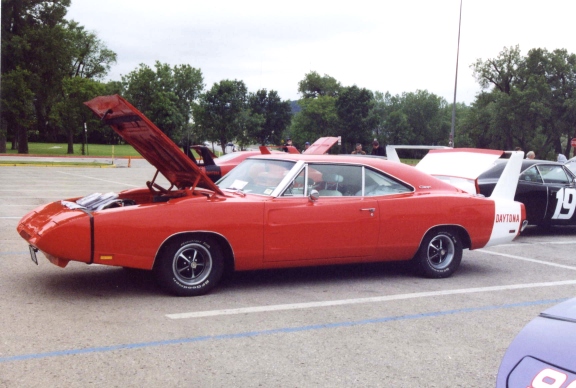 Along the way, James and Cyndi Keehler's #88 Daytona clone experienced some carburetor problems, so Wayne Perkins unloaded his #99 Daytona from the rollback and loaded the Keehler's car on for the remainder of the trip. Luckily for us, there was a genuine old-fashioned speed shop just a few blocks from our hotel, so we dropped off James' carb there for a rebuild and detuning (it came off a race car). There are few real speed shops left in the Midwest, so it was a real treat to spend some time shopping around in there. By later Tuesday evening, there were members from all over the US and Canada congregated in the lobby area of the hotel for a meet and greet.