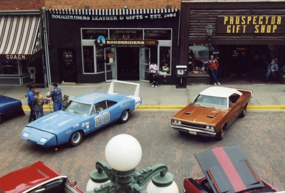 The members enjoyed checking out all of the casinos and the actual bar where Wild Bill was killed. Actor Kevin Costner also owns a casino/bar in Deadwood, where many of his movie costumes and and photos are displayed. Late afternoon, we started up our cars again, which produced another influx of patrons rushing out to look one more time, as the Mopars rumbled their way back out of Deadwood to return to our headquarters in Rapid City. Along the way, we took a sidetrip through Sturgis, the town famous for the Road Kill Cafe and the huge motorcycle ralleys.