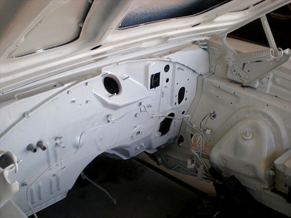 As it worked out, I took it to Ed's Body Shop (run by Ed Horner) in Adrian, Missouri on December 13, 2008. I brought it home finished on January 2, 2009. I had it repainted with 1968 Dodge Polar white (#8653) as I am not fond of the original Alpine white. I had the matching numbers drive train reassembled and stored at home and I replace the fuel system. In the photos below, you can see the extensive metal work that had to be done on the body, driver's side floor and the trunk floor had to be replaced. Ed had all of the rusty sheet metal cut out and new metal installed in one week's time.