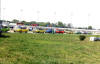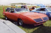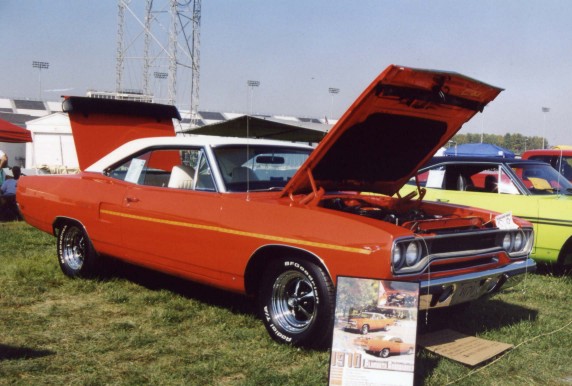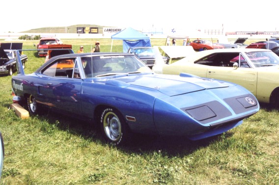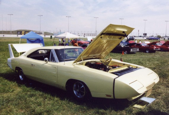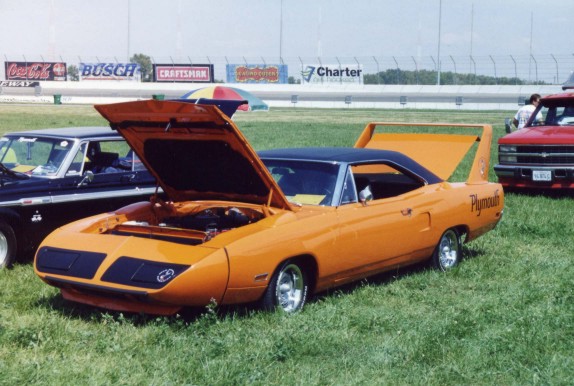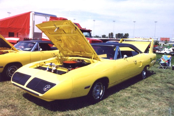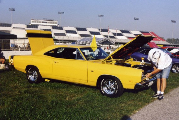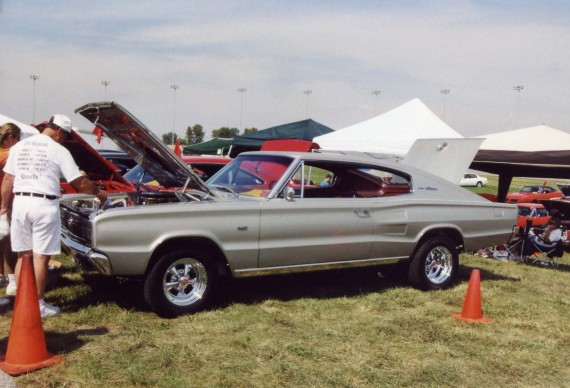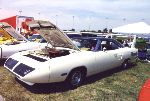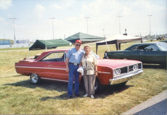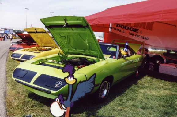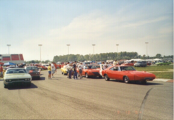 Saturday morning, everyone headed out to Gateway International where we had to wait in a long, hot line before we were able to make our way to the special Winged Warriors/NBOA parking area reserved for the members. Some members set up their tents and chairs, anticipating the need for a shady spot later in the day, while others immediately took off for the huge all-Mopar swap meet. Still others went over to watch the drag racing action. Dot and Cotton Owens were situated under a tent with their Dodge racecar right in the middle of the Winged Warriors/NBOA members. Dot sat at a long table and sold T-shirts from "Cotton Owens Garage" and postcards, while Cotton posed for pictures and signed autographs all day. At the end of the WW/NBOA, Mike Eberhardt had the Turbine car on display, occasionally starting it up to give people rides.