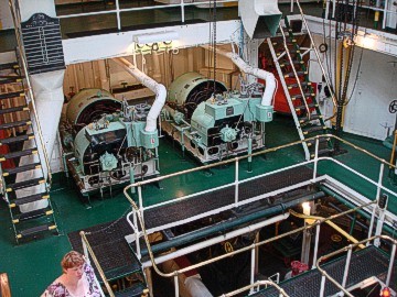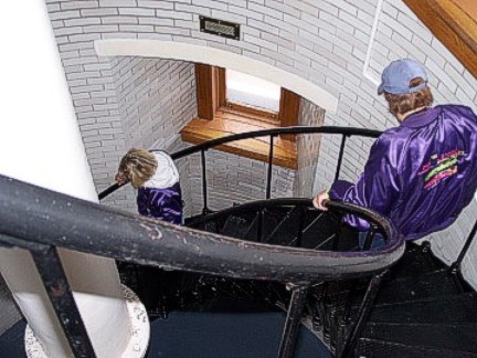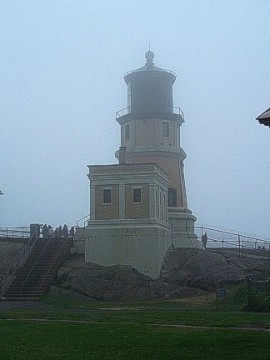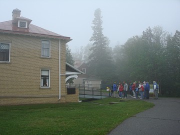 Thursday dawned very foggy, misty with a brisk cold breeze. Our group gathered in the parking lot and brought their Mopars to life for the drive north to Split Rock Lighthouse. I guess it's only appropriate that you should tour a lighthouse in the thick fog so you get the whole idea of what it's whole purpose was! After parking our cars, our group was gathered in front of the lighthouse keeper's house. The lighthouse keeper and his family lived in this brick house and it was his job to always make sure the lighthouse beam was on. When we entered the kitchen, a period-dressed woman was boiling potatoes on the old stovetop as the lighthouse keeper's wife would have in that day. We were shown each room of the house, where the lighthouse keeper would sit at his desk and type, take phone calls from incoming supply ships, where the children would play and sleep, where the adults slept. It was furnished with the original furniture, appliances and linens, and was quite comfortable and roomy. The lighthouse keeper's family led a very isolated life and they had to be quite self-sufficient because they saw no one for months at a time. Their visitors were the people who brought supplies by ship and occasionally relatives would visit during the summer months. When supplies arrived, the cargo would have to be lifted from the boat with a hoist and placed on a cart on rails and pushed and pulled up the side of the cliff, as the lighthouse sat on high bluff (rock) above the lake.