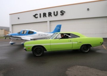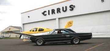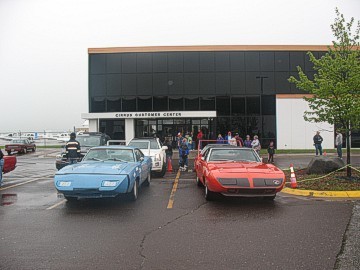 At 9:00 am on Tuesday, the distinctive rumble of Mopar big blocks could be heard and the 2008 meet officially kicked off with meet coordinator Gary Homstad leading us to Cirrus Aircraft Design. After parking our cars in a group outside the building, we were graciously welcomed into the reception area of Cirrus to meet our tour guide. Cameras were not allowed inside the plant hence we have no photos of the assembly line to share. However, after our lengthy tour, each of our cars were staged with a Cirrus plane outside the plant and the cameras clicked like crazy! Cirrus is the only manufacturer of Part 23 certified aircraft in the world with a rocket-deployed 55' parachute as a standard feature. The planes are made of carbon fiber, fiberglass and aluminum. The day we toured Cirrus they were building four-passenger 550 c.i. twin turbo planes with 330 hp @ 2,700 rpm. They carry 92 useable gallons of 100 octane aviation fuel and cost $548,000 fully equipped. The planes are put through a 20-minute test run and then four hours of flying time is put on each before it is certified by the FAA. The parachute, which can be deployed by the pilot or the passengers with an overhead handle, is a one-time use only. Just like our cars, you can get some options such as A/C and turbos on their planes. The assembly line tour was very detailed and extremely interesting. The serial number is placed on the fuselage when it begins its journey through assembly. A matching number set of wings is built elsewhere on the assembly line and catches up to the fuselage later. Four planes are built each day. They spend about 2-1/2 hours at each assembly line station. Cirrus has built over 4,000 planes to date. The service life of the planes is 12,000 hours. Cirrus aircraft can be purchased in blue, silver, white, red and gold. Any other special colors cost extra. Although we didn't get to see any, Cirrus was just gearing up to build a jet aircraft.