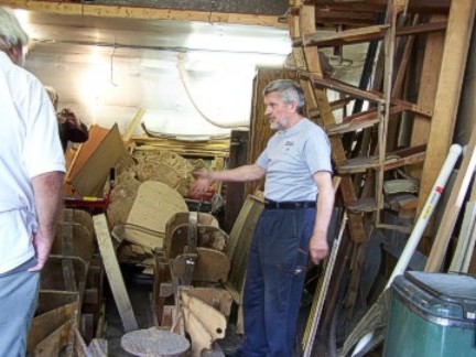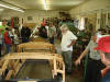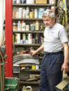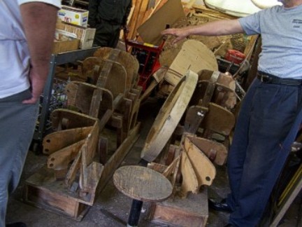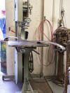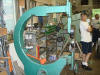 Cass is a very humorous man and showed us his "Polish Switch", a wooden pedal on a rope that he made that was attached to a seam rolling machine. Using the pedal he could stand at any position while using the machine. Since Cass is a one-man-operation and works alone, he has invented ways to work with the metal and wood by himself. The Polish Switch enables him to use both hands on the machine while turning it on and off with his foot.
