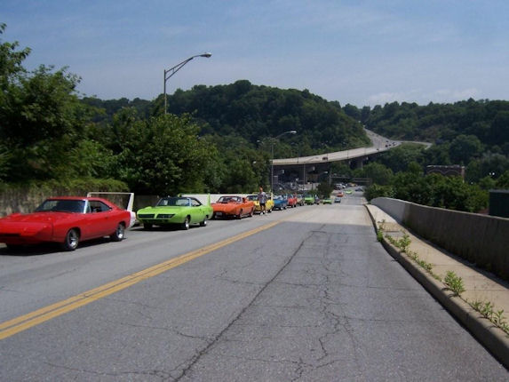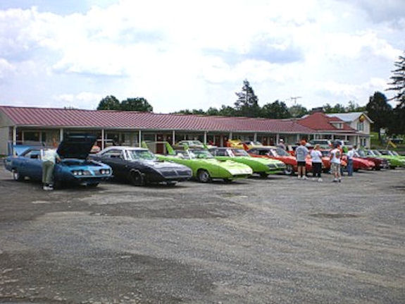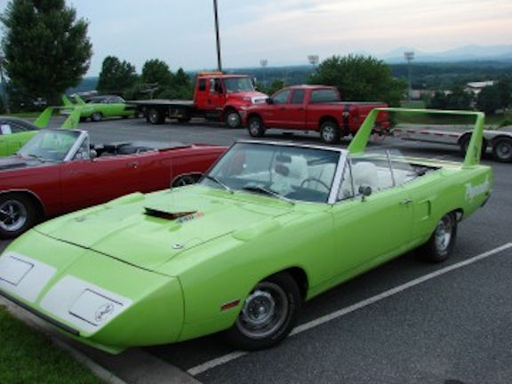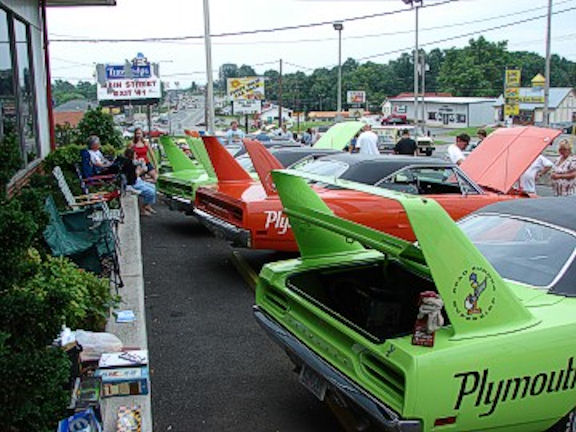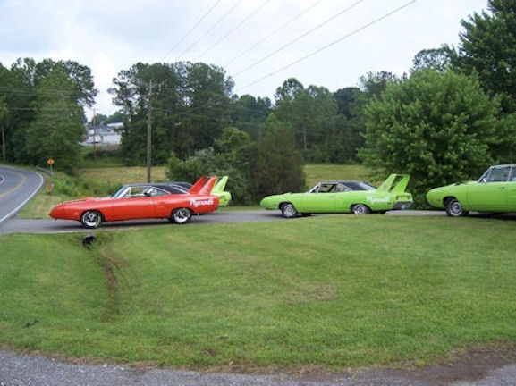 The remaining cars then cruised to Rita and Barry's for a farewell cookout, during which Rick Edwards and Stan McGuire did minor repairs to their cars. Stan--"It ain't a road trip if you don't have to fix one". There was nearly a constant train of cars pulling up to look at the cars and take pictures. the group then cruised to a local cruise-in at Liberty University, which takes place every third Saturday, April through October. Having seven wing cars, a '74 Charger Rallye and Stan's Runner convertible created quite a stir, as we had our own area roped off. We inadvertently hurt the feelings of the local Thunderbird club, as they were three rows down from us. Nearly every time you looked at the late '50s T-birds, the owners were all standing at the back of their cars looking like a bunch of Maytag repairmen as they watched everyone coming up to look at the wing cars. Thus ended this year's meet.