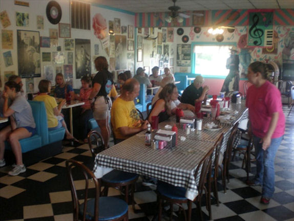 The group them cruised to "The Pink Cadillac" diner for lunch (below), a well-known local diner done up in late '50s motif, as well as being painted pink with a pink '57 Caddy out front.
