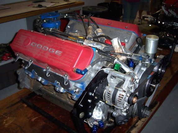Departing Arrington Engines, the group started what would prove to be an eventful return trip to Lynchburg. About half-way back in Chatham, Carl Swanson called on the cell phone to say he had no oil pressure. We immediately stopped to check this out, and after several checks, we started the car and decided things were not catastrophic. A wiggle of the lead on the sending unit seemed to put things right. We departed again, not making a quarter mile when Stuart Sutton's Birdable let it be known it wanted more attention by quitting under a railroad underpass. What appeared to be Stuart's second attempt at increasing the Birdable fuel mileage by running a partially obstructed fuel filter was repaired by our erstwhile road crew of Mopar medics replacing the fuel filter again. Stuart then took off, showing to all that his plan was obviously set such a pace to maximize coating distance should the Birdable run short of bird seed again (it did). Continuing to Lynchburg, the caravan came upon the Birdable across the street from the Lynchburg airport, about three miles from the Wingate. Even if Stuart had gotten the Birdable up to the world record speed (and it was not for lack of trying), I doubt he could have coasted the distance. At this point, our dedicated team of Mopar medics decided that the fuel pump was the problem and I went home, hooked up the enclosed trailer, and with the "Mopar manpower" we loaded the Birdable and returned to the Wingate. Another diagnosis session with the Mopar medics ensued, and the consensus was to replace the fuel pump. Proving that several of our members are familiar with the operating principal of "the 7 P's" (Proper Prior Planning Prevents Piss-Poor Performance) and that several of our members manage to store nearly the operating inventory of a NAPA or Advance Auto store in a B-body trunk, a new fuel pump was installed. However, this did not seem to fulfill the Birdable's need for sustenance, and a mechanical marathon ensued to install an electric fuel pump to get the Birdable under power for loading for the trip home. (Stuart finally diagnosed the problem of a defective fuel pump push rod after getting the Birdable home).