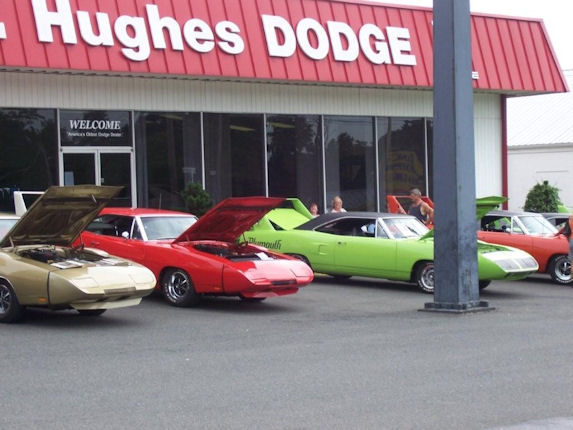 Sunday morning was slightly overcast but a great day for being out with the cars. Ten winged cars journeyed out to John P Hughes Motor Company, formerly the oldest continually operating Dodge dealer (they got caught up in the cuts). A good time was had by all, comparing notes, pictures of their cars, and looking over everybody's rides, as passersby were dazzled by the sight of that many wing cars lined up in front of the building. Owner Holcomb Hughes joked that the line-up of wing cars was probably worth more than the inventory on his lot. We were also joined by Rusty Nix (Aero Warriors) and his '69 Torino Talladega from Roanoke. When asked why he was allowed, I responded that they looked at the back of winged car quite a bit before, I figured he could look at the back of one for one more time.