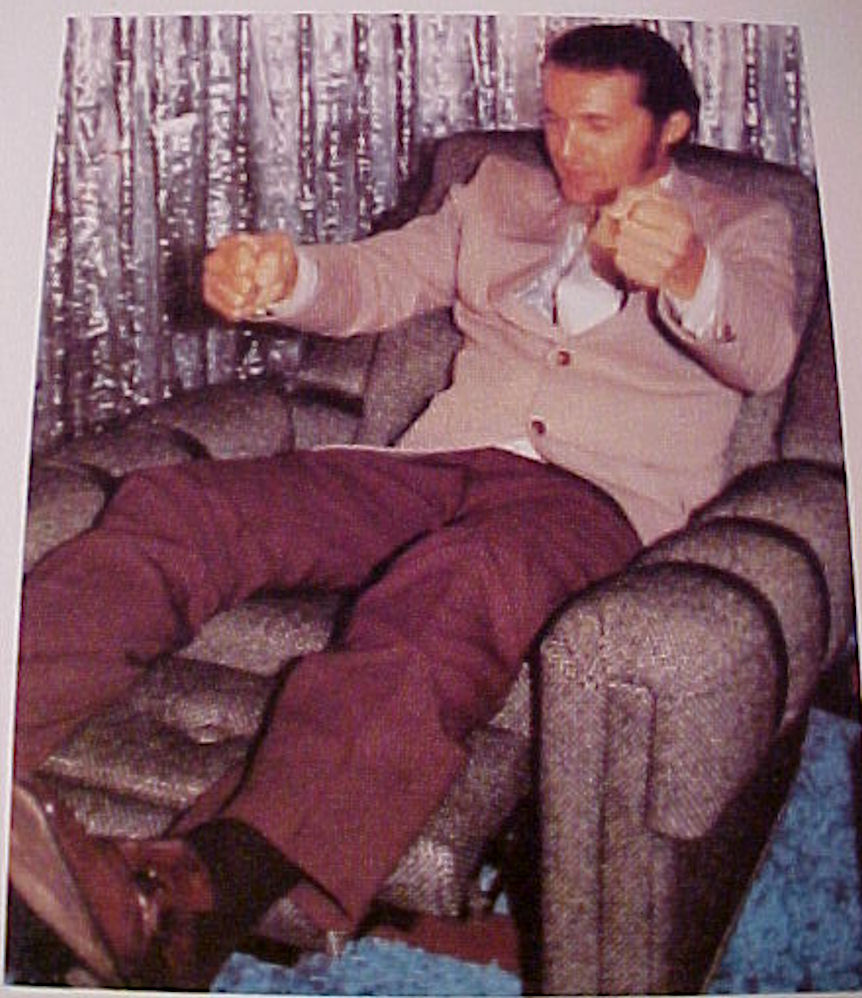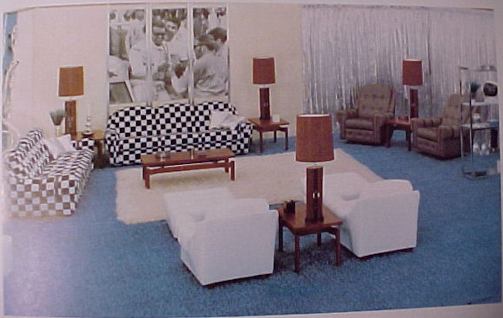 Check out the pictures in this invitation of the furniture. Does this scream 1971? That checkered flag couch, mag wheels on the wall, white recliners, Richard Petty blue shag carpet and the white shag throw rug are typical of the era!