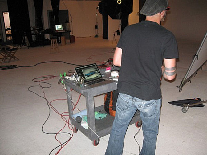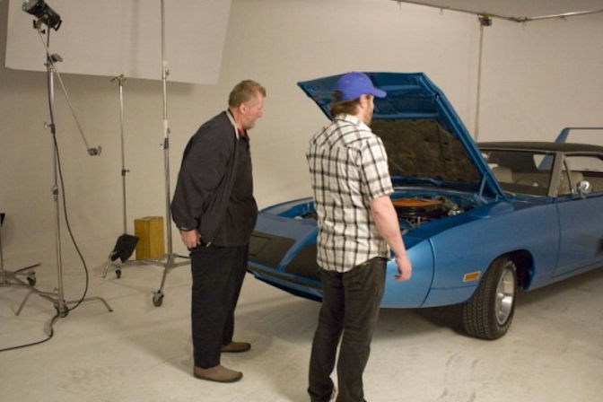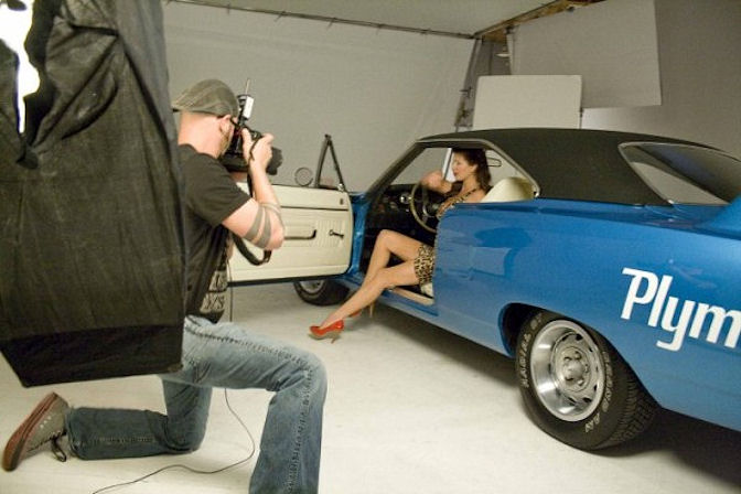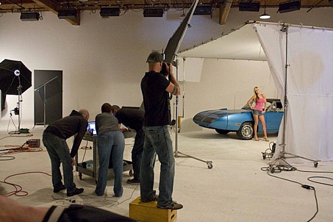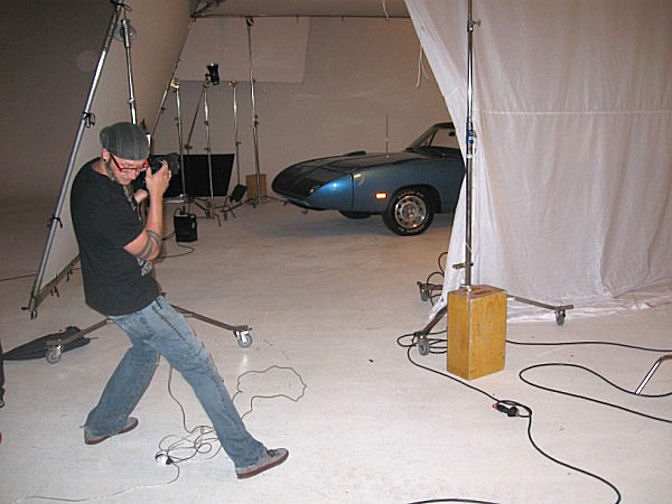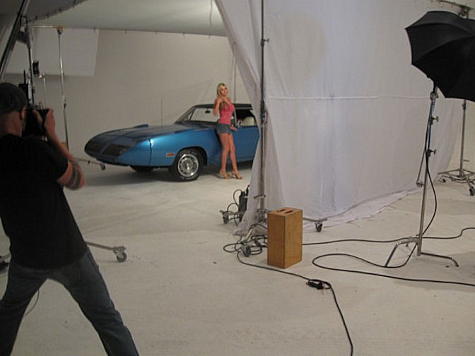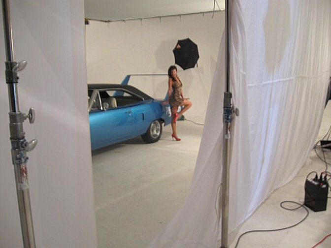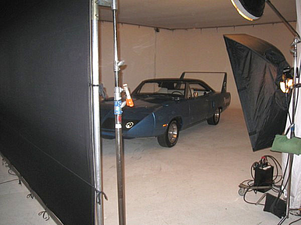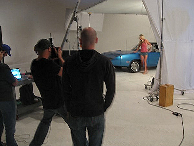 Kevin was in charger of the shoot and said for us to get the car inside the building which was no small task. The passageway was very narrow and they had to jack the rear end of the car up and set the tires on dollies. They hand-maneuvered the car into position to get it through the doorway. Once inside there was plenty of room to maneuver the car into position.