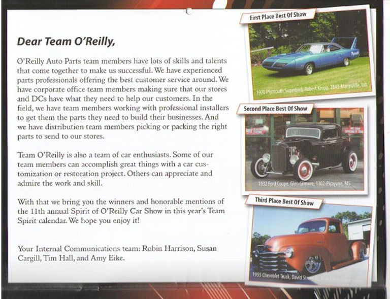 It was a BLAST and now that the car is done it is getting the notoriety that it deserves. I got more good news, as the Superbird was picked as the #1 car in the O'Reilly's Automotive Parts Employee Internet Car Show and appeared in their calendar for 2011. Two calendars in one year! I'm glad to see that other people recognize how great these cars are.
