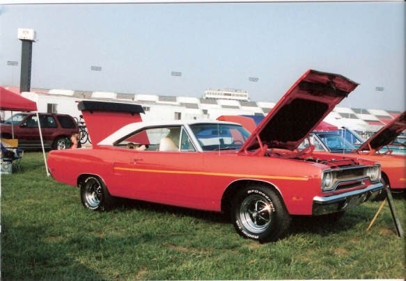I had a lot better feeling on this trip. Felt better about the fact I had more documentation and good quality pictures and the movie. We drove down and when we got there, we called him and went straight to his house. He opened his doors and arms like he had known us all of his life. That's the way Mopar people are. After the tour of the house and the RoadRunner room, with all of his RoadRunner toys, his wife said, "Dear, I think they want to see the car!" "Oh yeah," he said and took us out to the garage. There it was. Just as promised. Getting a little crowded around the car. You could tell he had not used it much lately. He started it up and we took it for a cruise. It was a done deal. We loaded it up and said our goodbyes and thanks and we were on our way home. We had no problems on the ride home. Stopped to sleep...yeah, right. The car of my dreams on a trailer in a town I knew nothing about. I slept with one eye open for about six hours and we were on our way home. And yes, I did all of the driving. We have been showing the car for four years now. We have made some changes to the car: 15" Rallyes, new door panels, headliner, vinyl top, reproduction battery, correct wing, new exhaust, re-chromed front bumper, electronic ignition and lots of TLC under the hood. But the car was done correct to begin with. I was able to get the name of the person who restored the car and it was the gentleman's first full restoration. I talk to him about once a year. As you can see, the car is holding up well. It's been done about 12 years now and shows some signs of wear, but overall shows well.