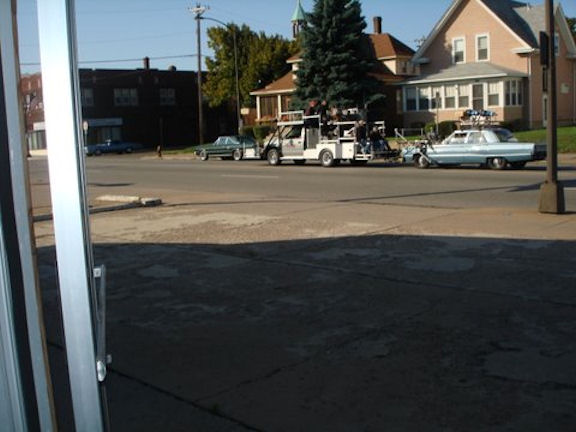 After it was done, I called Mike and we made arrangements to bring the car down to their production company. I drove "Our 66" and Janet followed. The photo below shows granny Coronet leaving for the movie set. We parked in the front of the building and met with Mike and Mark. They looked the car over and Mike jumped in the passenger side and had me drive him around to the rear of the building while Mark took Janet inside. Janet was seated at the reception desk and watched as people auditioned for parts in the movie and occasionally she had people coming in and asking her receptionist questions that she could not answer.