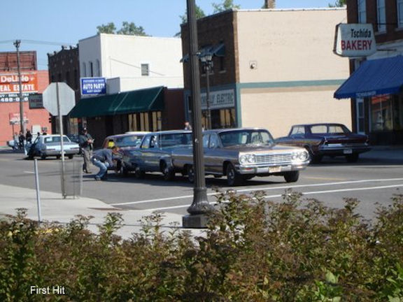 Upon arriving, Mike greeted me with the comment, "I am sure glad you could make it. We sure need some color." As I looked around most all of the cars were pale green, blue, brown or gold. There was a red Mustang and a yellow Ford, but that was about it for bright colors. I spent twelve hours on the set that day but the following day with rain predicted changed their schedule and they shot at another location with different cars. Before I left, Mike said to me the red car is locked in and he needs it there for the rest of the shoot but it was too flashy for the shoot the next day.