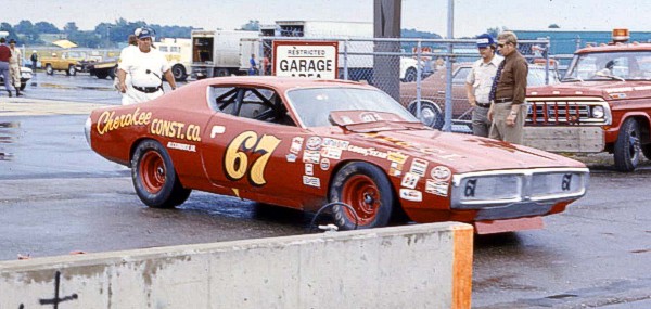 The next group of photos above were taken in 1975 at the Darlington Rebel 400, from left to right: #15 (white) Buddy Baker and Richard Petty in the pits; G. C. Spencer and Darrell Waltrip and Richard Petty in the pits; the last two photos show Richard Petty's Charger pitting.