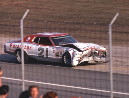 The photos above were all taken in 1976 at the Daytona 500 race. From left to right: Richard Petty and #2 (red) Bobby Allison and #21 (white/red) David Pearson and #72 (white/gold) Benny Parsons; the next three photos show Richard Petty's wreck at the Daytona 500.