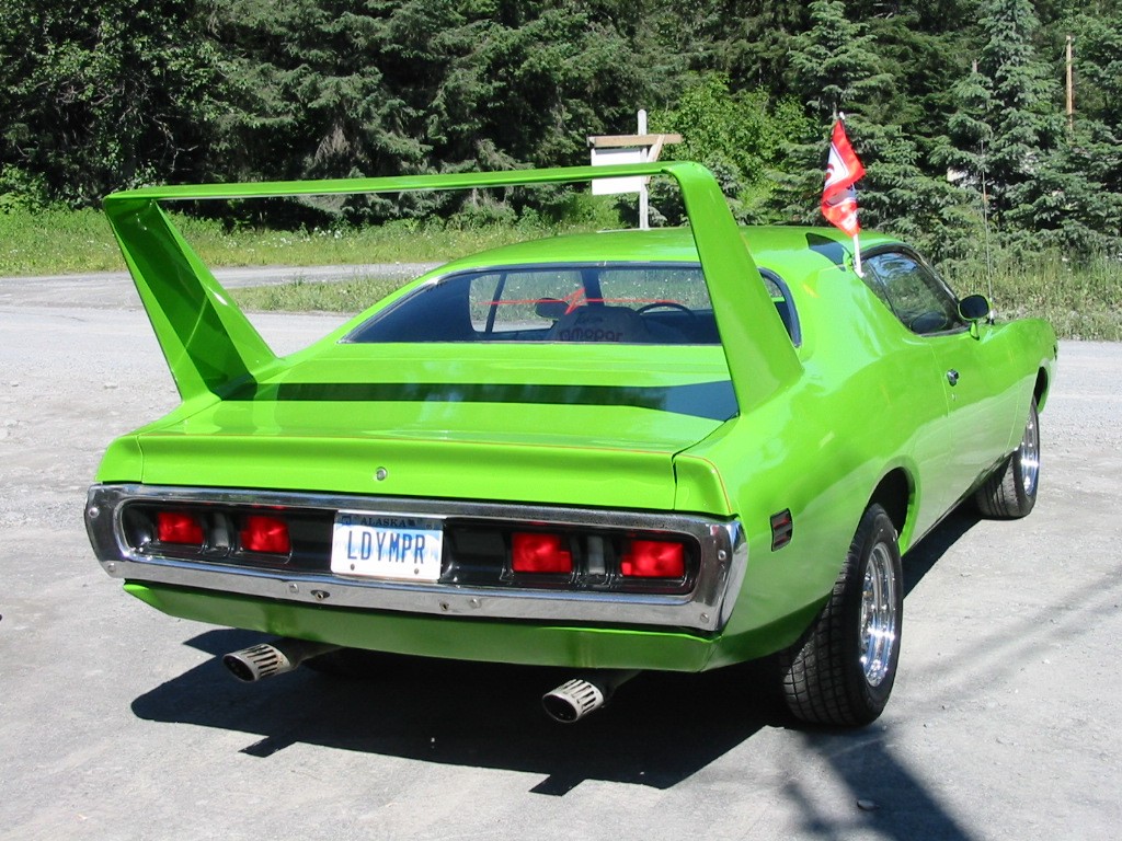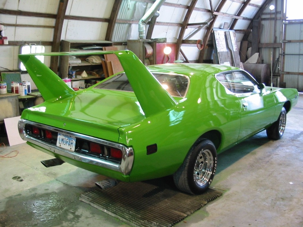 During all of this, I had also decided that the car was going to have a Daytona wing. Everyone said it would look dumb and as the years passed by a wing never materialized, confirming everyone's belief that it was not meant to be. I was persistent on the wing (I didn't want a small cheesy wing for MY car). I was even designing my own to put on. Six years later, I received a call that someone had a wing for me! I didn't hesitate and said yes, and made arrangements to get it up here. When it got here, it was too wide and too short! My husband worked many hours and molded it into the car and added two inches. I love it so much! I must say that Daytonas, look funny now, they're wings are bolted on.