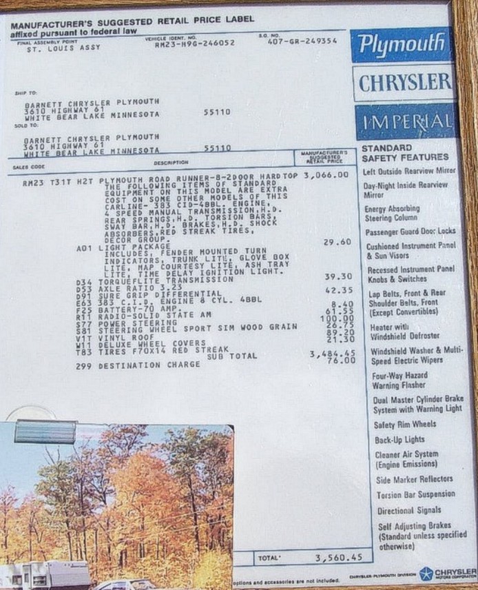When the cars became popular, the topic always came to the "production broadcast sheet" or more commonly referred to as the build sheet, so I had to look for it. Originally I found two. One was in the springs under each seat which were both incorrect build sheets. A year or so later, a guy asked me what size gas tank the RoadRunner had and I didn't remember, so I looked in the owner's manual. Folded neatly in the back of the owner's manual was the correct broadcast sheet! I can only assume that the correct one was placed there by the selling dealer who had received it with other paperwork, as I have never heard of one being found there before. Nonetheless, I was very happy to find it!