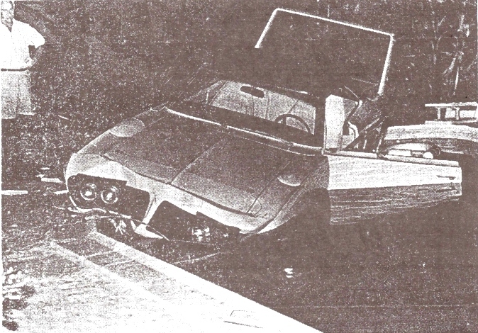 The driver of my much-admired Lemontwist Superbird had loss control at some absurd speed and ran the car up the side yard of a neighbor's house. It's final resting place was in the swimming pool, as shown in the newspaper clipping below which appeared in the next morning's paper. This is why some animals eat their young!