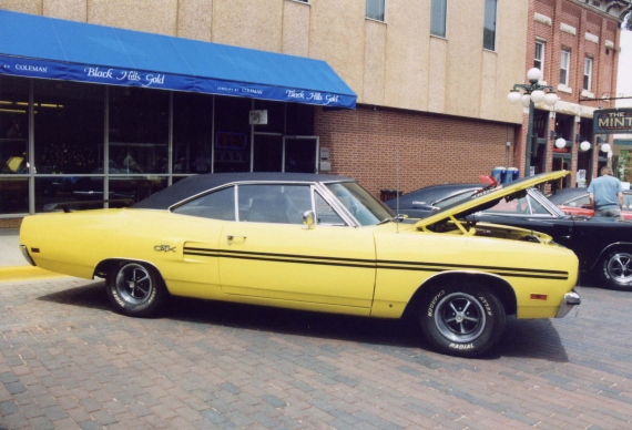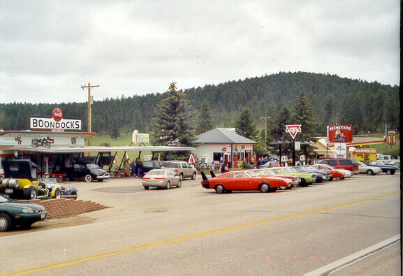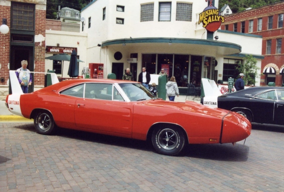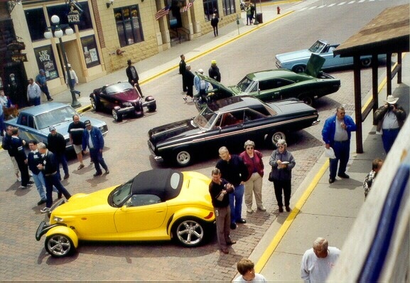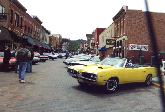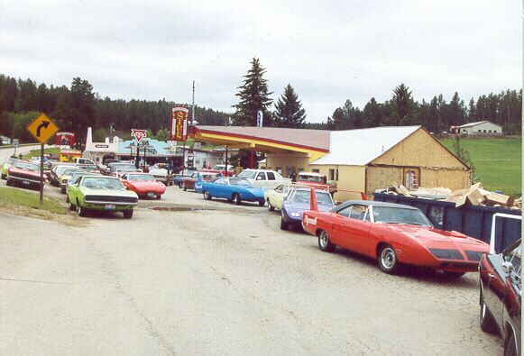 The members enjoyed checking out all of the casinos and the actual bar where Wild Bill was killed. Actor Kevin Costner also owns a casino/bar in Deadwood, where many of his movie costumes and and photos are displayed. Late afternoon, we started up our cars again, which produced another influx of patrons rushing out to look one more time, as the Mopars rumbled their way back out of Deadwood to return to our headquarters in Rapid City. Along the way, we took a sidetrip through Sturgis, the town famous for the Road Kill Cafe and the huge motorcycle ralleys.
