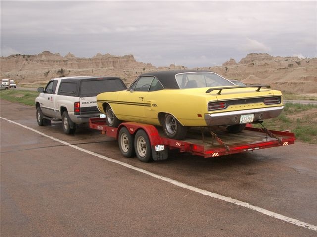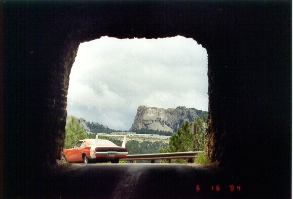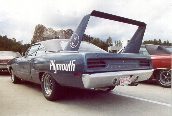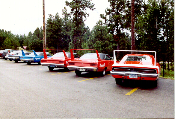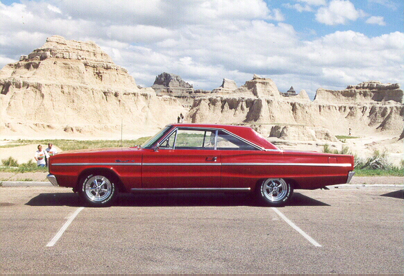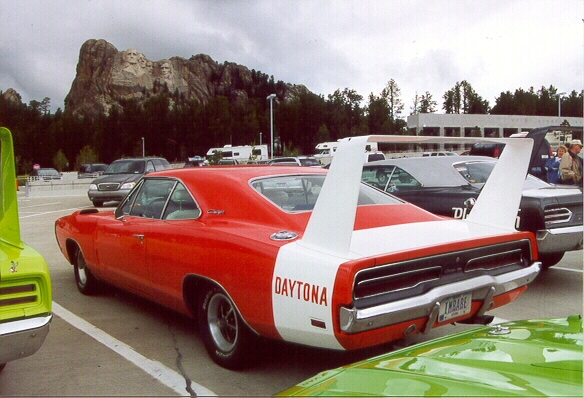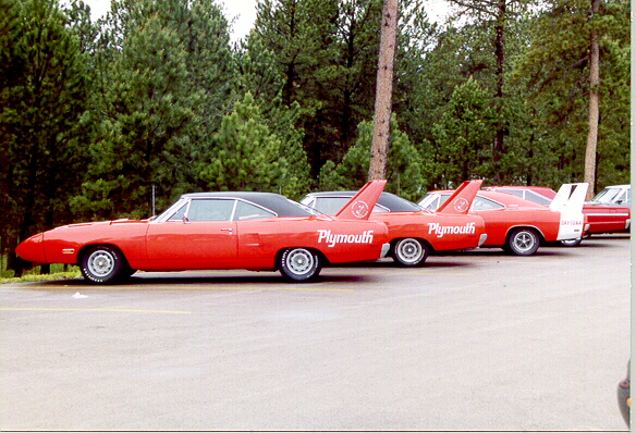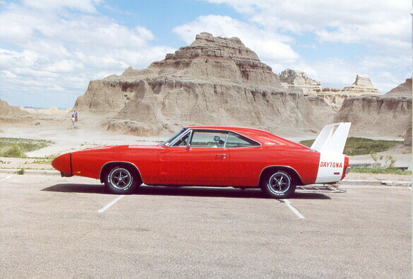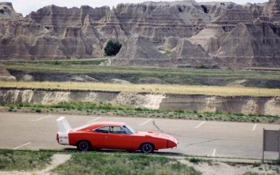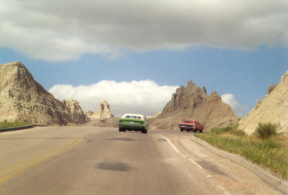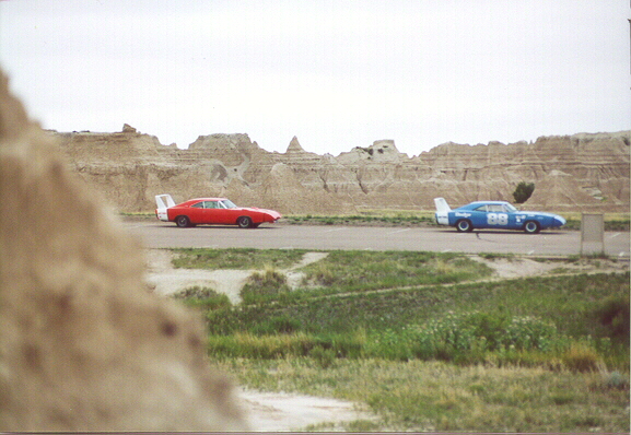 Photos above are scenes from our trip through the Badlands with Sue and Ed George's orange Daytona, Janet and Bill Kuenkel's Sassy Grass 1971 Barracuda convertible, Janet and Curt Lawson's red 1966 Coronet and Cyndi and James Keehler's #88 Daytona clone, Roger and Rochelle Wilson's 1970 Lemon Twist GTX and four photos of the cars at the hotel.