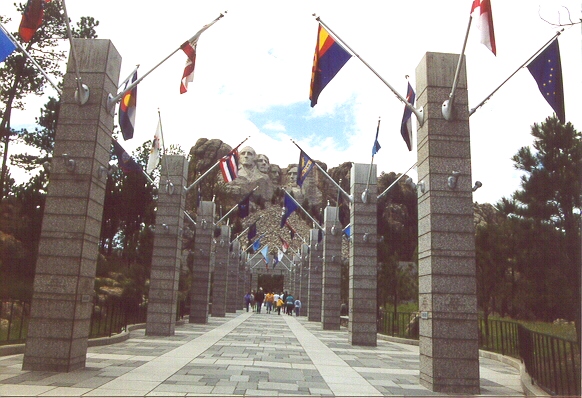 From Crazy Horse, we cruised to Mt Rushmore Monument. Once again, our group was directed to ramp six of the parking lot for our special parking area. Members took this opportunity to shoot some photos of the cars with Mt Rushmore as the background, and then we wandered down to the base of the monument for some close-up photos. There is a beautiful display of pillars and state flags that lead you out to the base of the monument. On the observation deck, there was a theatre showing films on the construction of Mt. Rushmore and a small restaurant and ice cream shop. While our group was enjoying the monument and learning about its history, a lot of the other sightseers at Mt Rushmore were walking up to ramp six to look at our cars! Photos below are from our visit to Mt Rushmore.