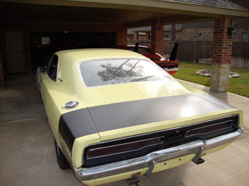 The Charger 500 is a Y2 (yellow) 440 automatic with, once again like my Daytona, a factory 4.10 Dana. I'll probably take liberties with this one. It'll eventually be converted to a 4-speed. But for now, I'm going to just get her mechanically good-to-go and drive my "Joe Dirt" 500. You see, it is a Y2 yellow car with a primered front clip and a Daytona stripe. It'll be a while before I can paint it, but that won't stop me from enjoying it out on the road. Maybe Kim will like this one; she won't drive the Daytona out of fear of something happening. So now I'm a two-aero-owner via trades,