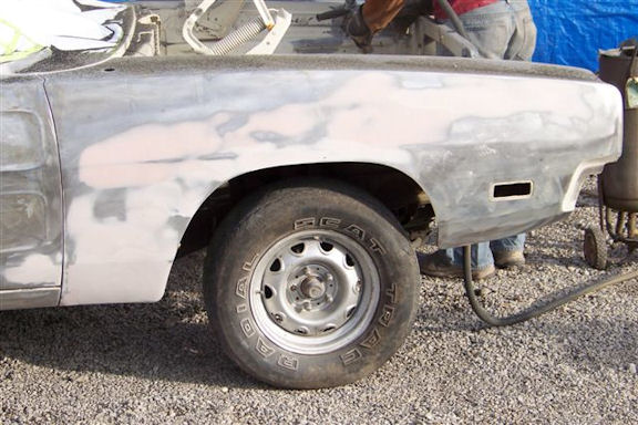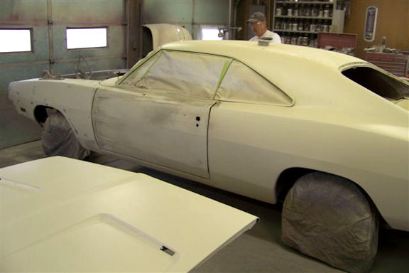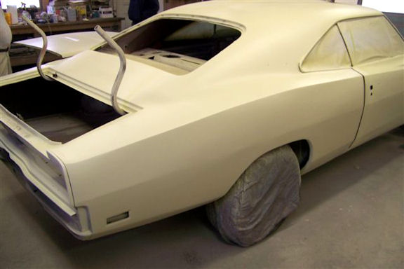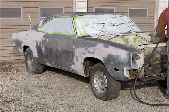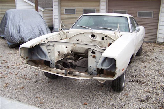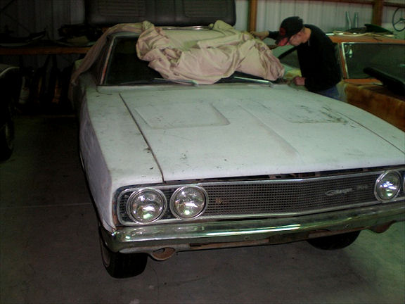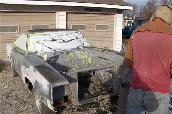 As it worked out, I took it to Ed's Body Shop (run by Ed Horner) in Adrian, Missouri on December 13, 2008. I brought it home finished on January 2, 2009. I had it repainted with 1968 Dodge Polar white (#8653) as I am not fond of the original Alpine white. I had the matching numbers drive train reassembled and stored at home and I replace the fuel system. In the photos below, you can see the extensive metal work that had to be done on the body, driver's side floor and the trunk floor had to be replaced. Ed had all of the rusty sheet metal cut out and new metal installed in one week's time.