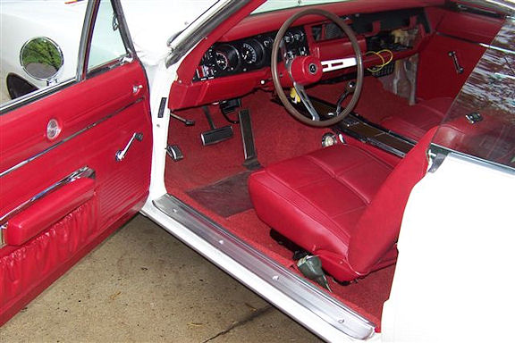 Once Ed was done with the body and paint, I took the car home and spent the rest of the spring putting in a new heater core, and reinstalling the dash, carpets, seats, console and door panels. The red interior pieces were all either new or refurbished. Then the engine and transmission were installed. After I got the car running, there was a horrible noise coming from the front. I talked to several people and got several different opinions as to what it might be. The noise went away when the car was on jack stands, but I got a vibration through the seat. Therefore, it must be the torque converter. Finally I took a photo of the harmonic balancer, due to not being able to see it, and sure enough, it said "cast crank" on it. I had installed the correct torque converter for the car, but it was wrong for the motor. After that issue was resolved, I put new disc brakes on and my Kelsey Hayes recall wheels finished the car off.